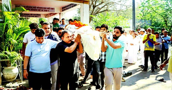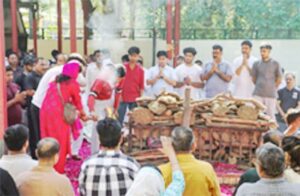 विश्राम स्थल पर मंत्रोच्चार के बाद अंतिम संस्कार शुरू हुआ. शव को कंधे पर लेकर चिता की ओर बढ़ते समय ‘राम नाम सत्य है’ गूंज रहा था, जो मानो चीख और शांति के बीच समन्वय स्थापित कर रहा था. चिता को चारों तरफ से लाल गुलाब की पंखुड़ियों से सजाया गया था. परिवार, पड़ोसी और रिश्तेदारों की भारी मौजूदगी थी. ब्रह्माकुमारी संस्थान के भी लोग आए थे. उनका कहना है कि शरीर नश्वर होता है.