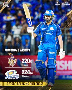 इससे पहले टॉस हारकर पहले बल्लेबाजी करते हुए केकेआर की टीम ने पूरे 20 ओवर में 4 विकेट खोकर 220 रन बनाए. जिसमें कप्तान रहाणे के 40 गेंद में 67 रन, फिन ऐलन के 17 गेंद में 37, रघुवंशी के 29 गेंद 51 और रिंकू सिंह के 21 गेंद में 33 रन सबसे खास थे. दोनों टीमों की तरफ के गेंदबाजों की खूब पिटाई हुई. लेकिन मुंबई इंडियंस के शार्दुल ठाकुर सबसे सफल गेंदबाज रहे. उन्होंने 4 ओवर में 39 रन देकर 3 अहम विकेट हासिल किए. जिसकी वजह से उन्हें प्लेयर ऑफ दि मैच का अवॉर्ड दिया गया.