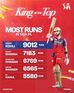 इस मील के पत्थर ने उन्हें टूर्नामेंट में सबसे ज्यादा रन बनाने वाले बल्लेबाजों की सूची में और ऊपर पहुंचा दिया. दूसरे स्थान पर मौजूद रोहित शर्मा उनसे लगभग 1900 रन पीछे हैं. बता दें कि 275 IPL मैचों में कोहली ने 40.05 की औसत और 133.80 के स्ट्राइक रेट से कुल 9012 रन बनाए हैं, जिसमें आठ शतक और 66 अर्धशतक शामिल हैं.